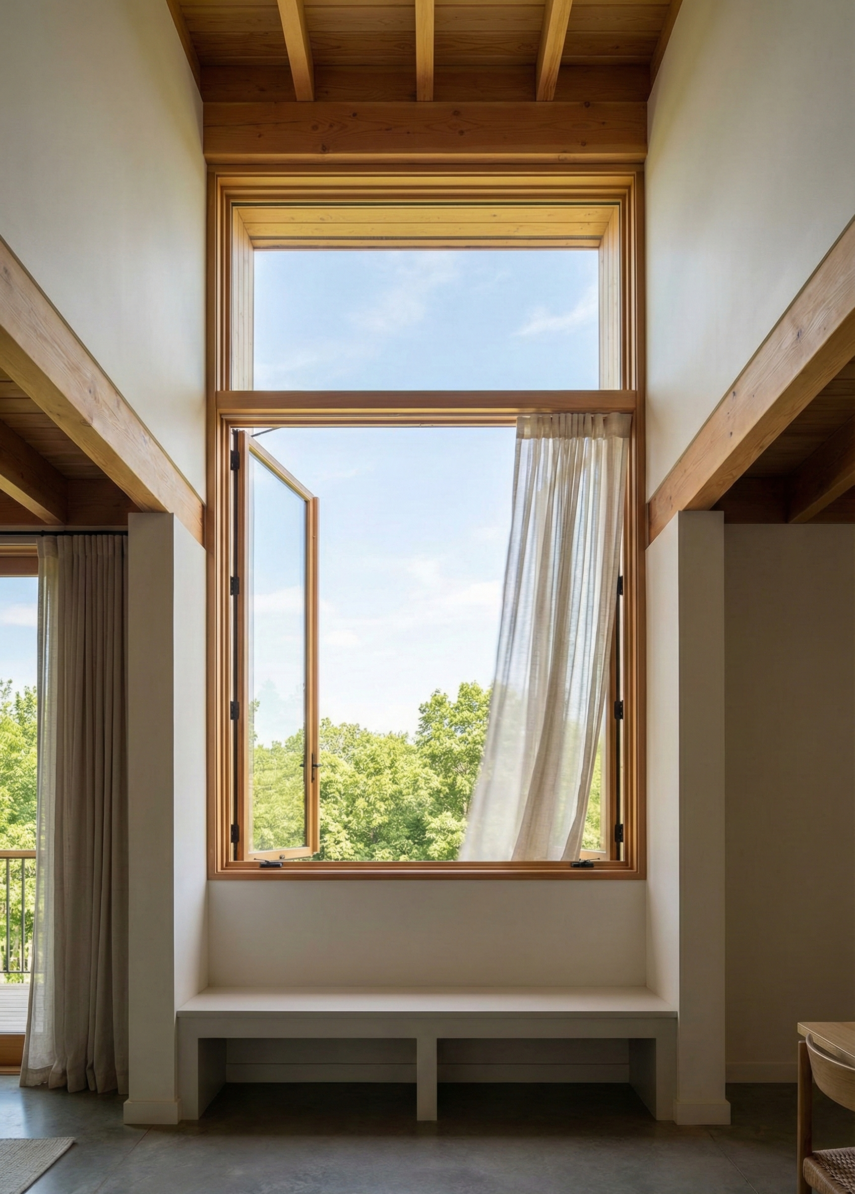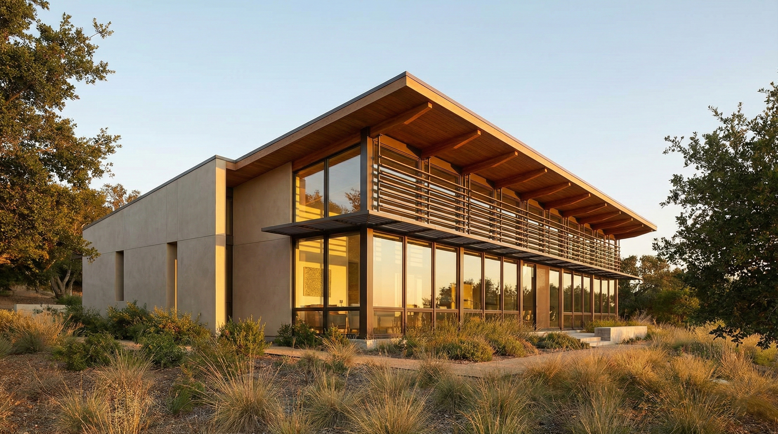 We detail roof overhangs and structural shading that block harsh summer sun while inviting winter warmth. This creates a responsive building envelope that naturally regulates temperature.